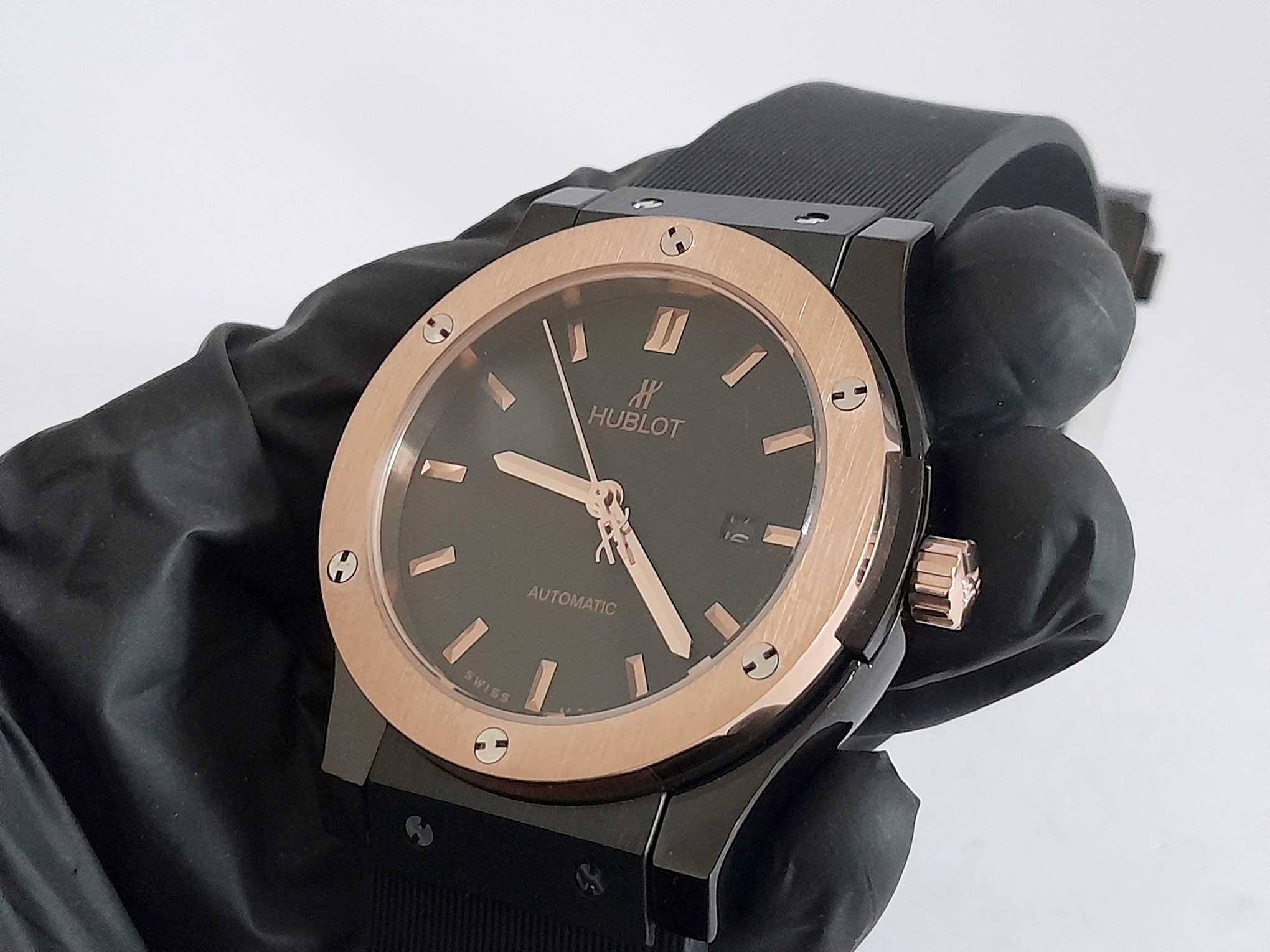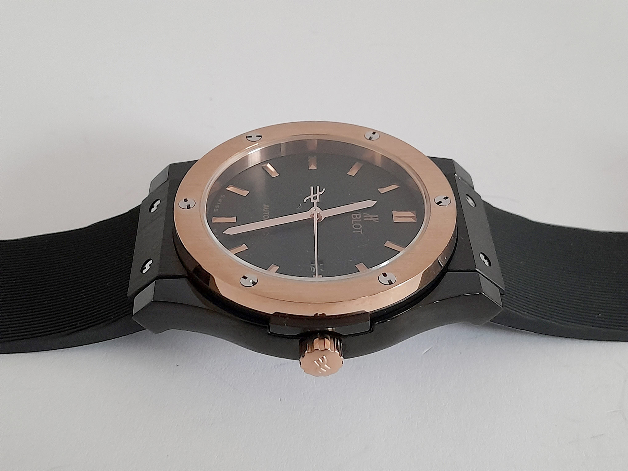 REL HUBLOT FUSSION CAUCHO NGR CAJA PAVONADA BISEL ORO-ROSA C/NGR # LINEAS ORO AUTOMATICO