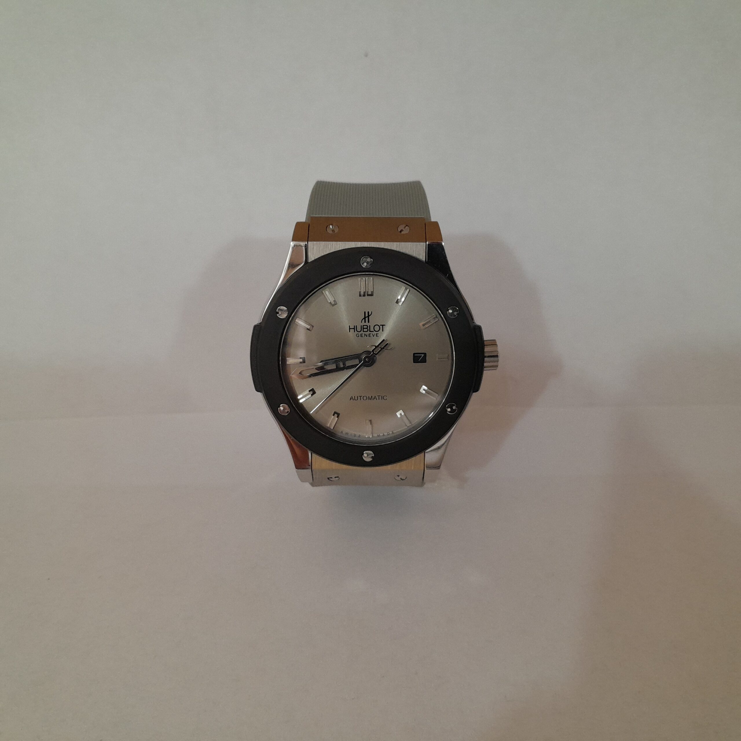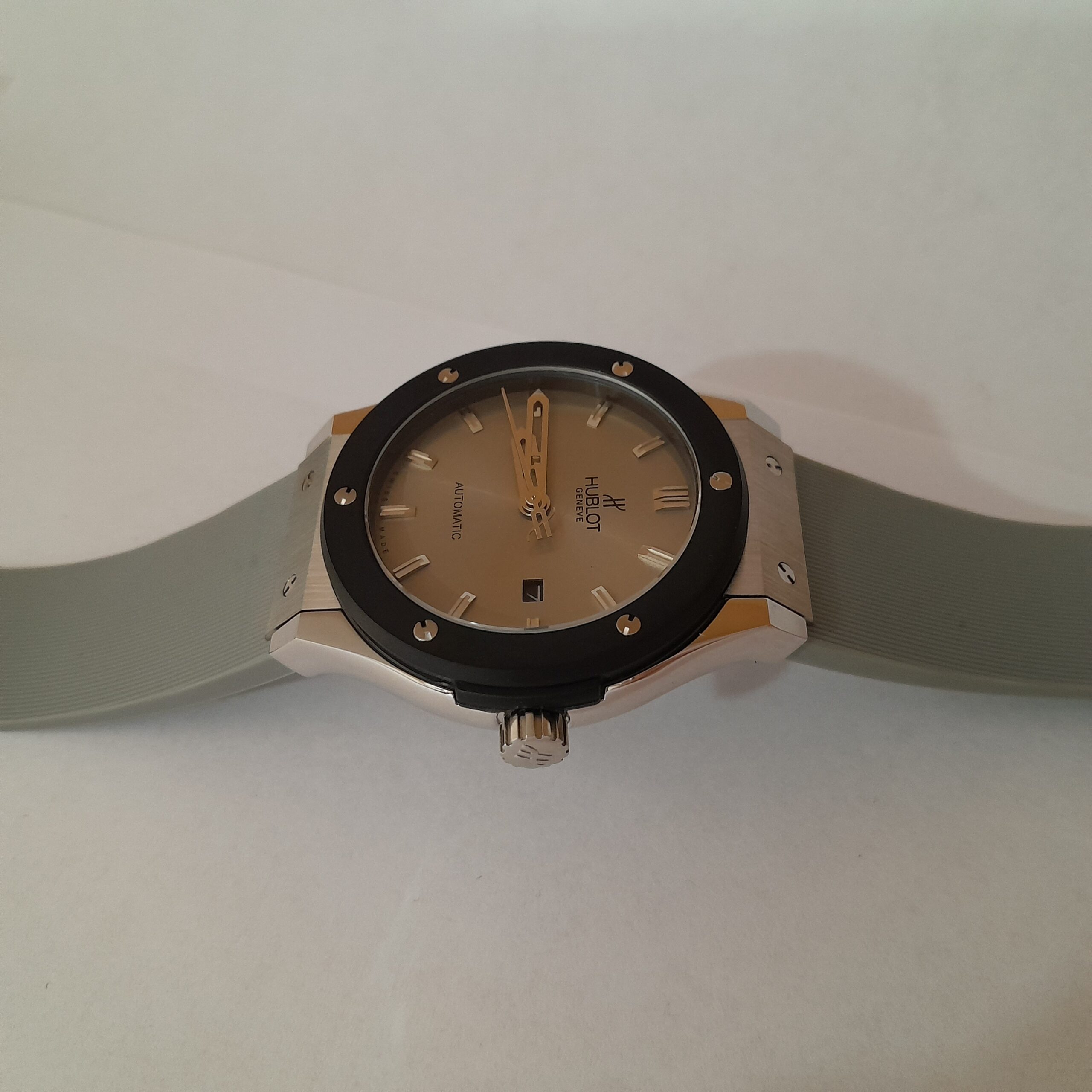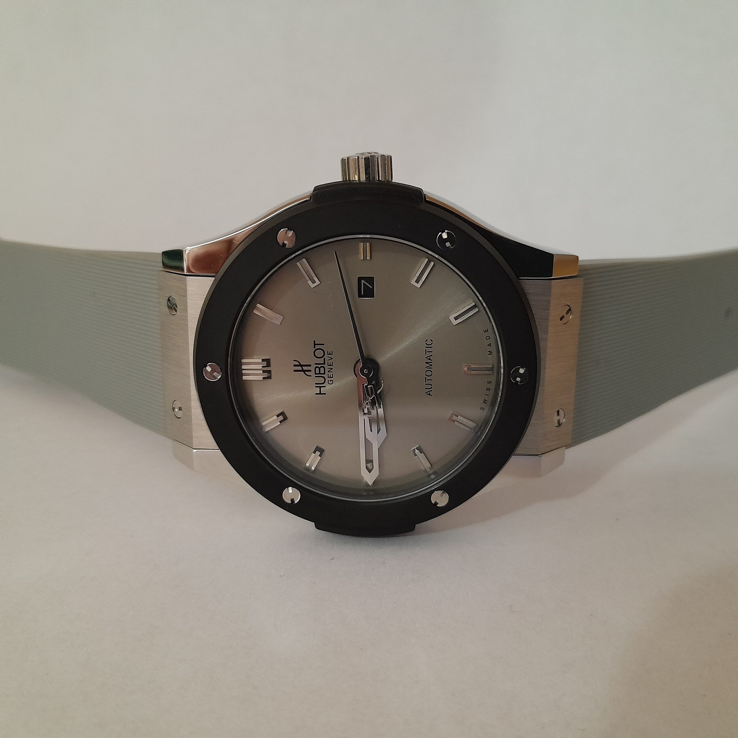 RELOJ HUBLOT CAUCHO GRIS CAJA ACERO BISEL NGR C/GRIS # LINEAS PLT AUTOMATICO